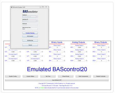 The free BASemulator replicates on a PC the operation of the BAScontrol series of open unitary controllers, thereby allowing sequence of operation (SOO) verification without having the actual controller. Using a PC, engineers can view the same program that will be used on the job to verify that it meets the engineer's intended sequence of operation. For a contractor, programs can be developed, configured and then saved on a PC for eventual downloading to the intended controller at the job site.