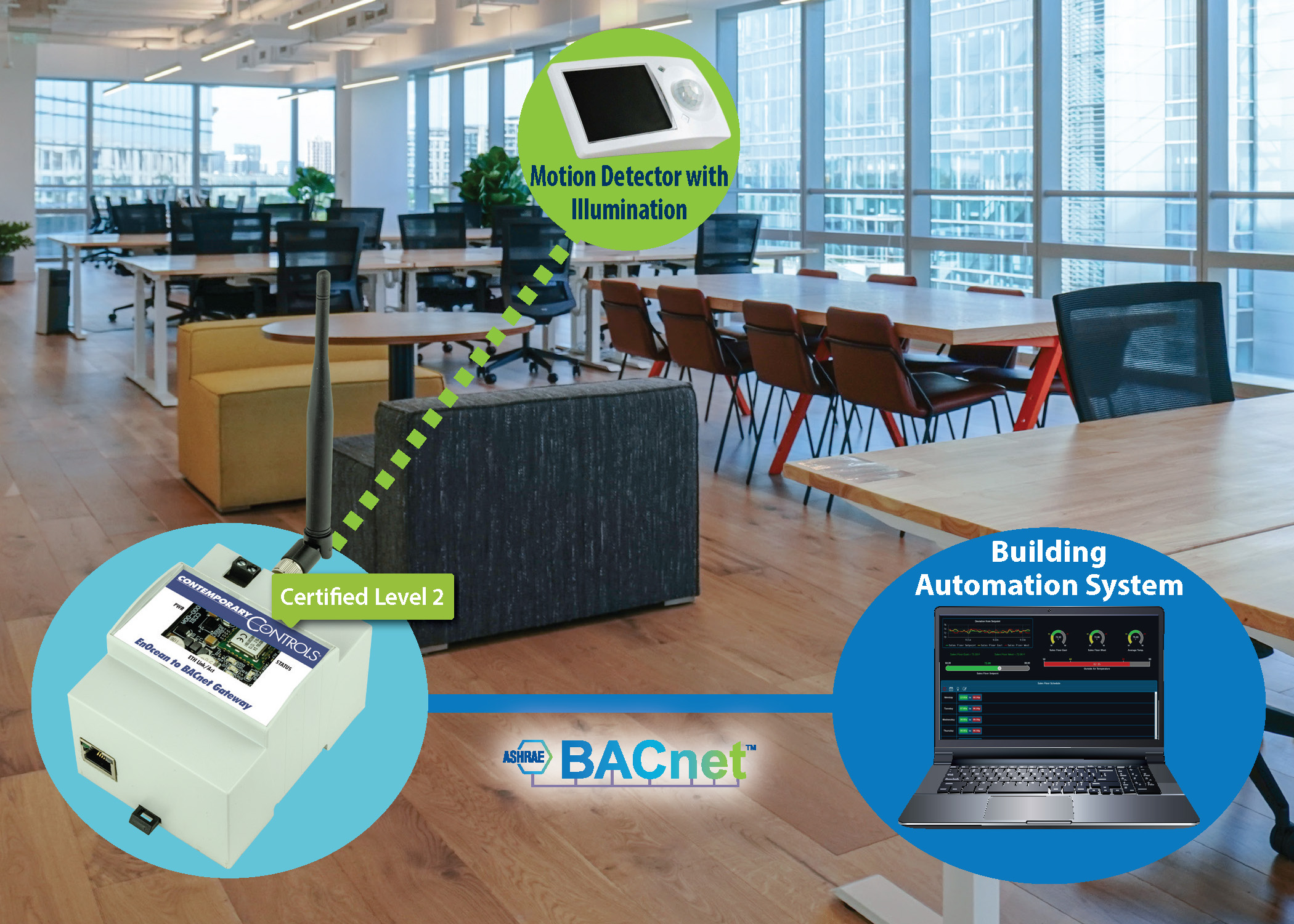 Effective occupancy detection in commercial buildings, hotels, and offices is critical for energy efficiency, space optimization, and occupant comfort. Traditional detection methods rely on wired sensors with complex installation requirements and limited flexibility. An occupancy detection system that incorporates wireless PIR motion detectors with EnOcean illumination sensors and Contemporary Controls' EnOcean to BACnet Gateway provides a comprehensive, easy-to-implement solution that enhances energy efficiency, improves space utilization, and optimizes building management.